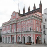 The district around the Petrikirche received its town charter in 1218 which probably meant that the old town featured a city hall at Rostock’s market square “Neuer Markt” by that time. After the three districts merged in 1265 the Neuer Markt became the unified city‘s new location for a common and larger city hall. In contrast to the building in Lübeck and Stralsund the city hall in Rostock doesn‘t form an ensemble with the city‘s main church St. Mary but is located further away from the “Marienkirche”. In 1419 the city hall was converted into the university‘s Auditorium Magnum.