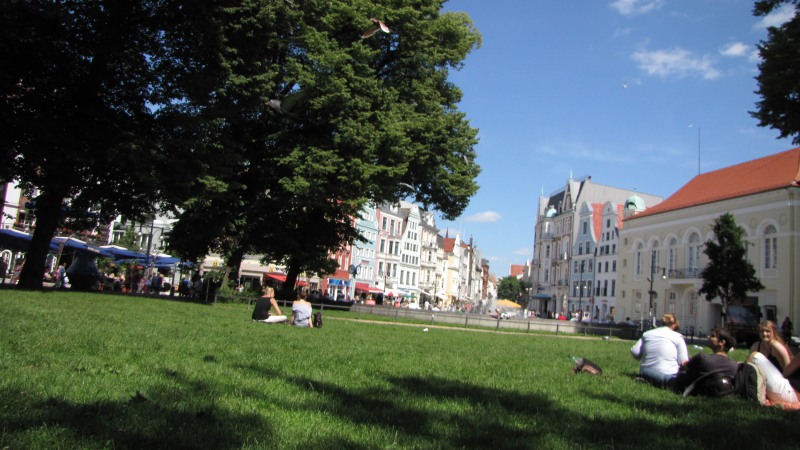 Today let’s talk about the so called “Universitätsplatz”. It’s located in the middle of the “Kröpeliner Straße” and it’s THE meeting point for people of all ages. You’ll always find students and younger people there relaxing on the meadow behind the fountain, maybe making some nice tunes on their guitars or having some fun with various activities, e.g. juggling, footbagging, freestyle jumping etc. Not to miss the older people of course, who are mostly relaxing there, feeding some birds and enjoying their afternoons, while drinking some coffee and eating cakes in the nearby cafés. Sometimes cultural events like open air concerts, the Christmas, Easter and other markets take place around that area. To conclude it never gets boring there and never quiet.