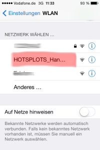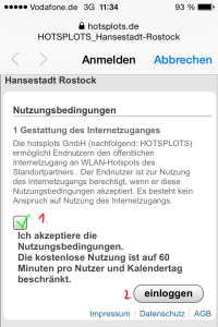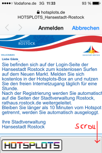The connection there is a lot faster than at the Kabel-Deutschland-spots, and you can use the internet for 60 minutes. The procedure is quite similar, though: Select the WiFi network (“HOTSPLOTS_Hansestadt-Rostock”); then open your browser, and on the login-page scroll down and tick the box. The city’s homepage will open, but feel free to just ignore that.