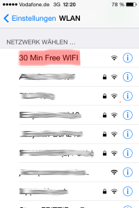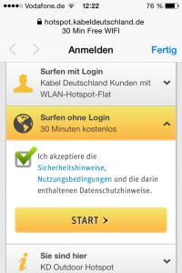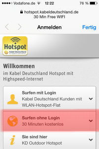Kabel-Deutschland, a big German telecommunications provider, has set up several hotspots that let you use the internet for 30 minutes. All you have to do is to select the right WiFi on your device (“30 Min Free WIFI”); after you’re connected, open your browser, and you will be forwarded to a log-in page. Click on “Surfen ohne Login”, tick the box to accept the terms of use, and hit “Start”. Et voilà: You are now online to check your mails, update your facebook, plan your next trip, or check out Germany’s “hottest” entertainer on youtube 😉