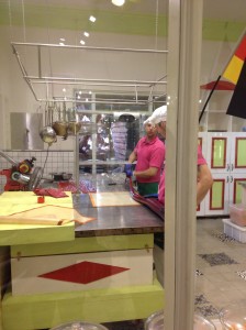 We walked past the “Traktorbahn“ (where you can ride on a tractor on rails), the “Fliegender Kuhstall“ (flying cowshed, a funride that looked like it would make Dorothy’s flight to Oz seem like a walk in the park), and the petting zoo , and through a small shop, until we reached a building labeled “Eiswerk“ (ice studio)…