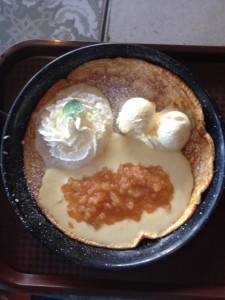 Karls Appelpankoken with apple compote, vanilla ice cream, custard, and whipped cream