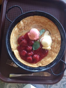 Pancake “Frollein Piepenbrink“ with strawberry compote, vanilla-, and strawberry ice cream