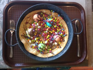 Pancake “Kackfidel & Poppenlustig“ with marshmallows, melted chocolate, and chocolate beans