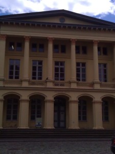 There you’ll find a few architectural and cultural sights, that are easily overlooked when strolling down the crowded bustling shopping street such as the main building of the university of Rostock, the monastery of the holy cross, the monastic garden with a cozy little café called the Klostercafé – and to the left, just before you walk through the archway entering the monastic grounds, you’ll find the institute of zoological research that houses the zoological collection in a yellow Roman-inspired building.