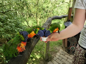 Somewhere in the middle of the park, we came to the “Lori-Bar“. Don’t let the name lead you astray, though; it is not a bar where humans can sit down and sip cocktails. It is a bar where you can purchase a small cup of nectar for 50ct to feed them to small parrots called Loris. Feeding birds might not sound all that exciting, but believe me, the little cheerful birds are quite cheeky; if you are patient, they will even climb onto your hand to get better access to their sweet treat. It is definitely worth spending the 50ct on a drink 🙂