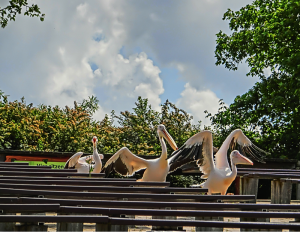 We picked up a flyer with the map and times for special events at the entrance — there are several opportunities to watch the keepers feeding the animals, as for instance the pelicans, the otters, white storks, etc., and talk about them — and off we went. Lucky for us, the first event, the feeding of the pelicans, was scheduled for 10:30, and we didn’t have to wait too long.