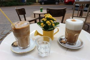 In Erich-Schlesinger-Straße there is not really a Café, but if you walk to KTV or Doberaner Platz you have many opportunities to sit down in a café.