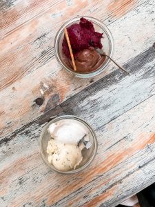 What I really like about this place is the fact that every customer is treated individually, friendly and with the same open-minded attitude. The staff is informed about all kinds of allergies and really tries to create a refreshing, mouth-watering and aesthetically pleasing ice cream cup that suits you and your individual diet the most. Another plus point is the rustic and vintage interior design of the ice cream shop. Whenever stepping by for a short break at “VEIS”, it always feels like stepping into another world: the smell of the antique wood always reminds me of my grandparent’s home, and the appearance of the colourful and mixed furniture pieces make me feel cosy and welcomed.