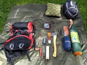 Personal basic equipment on a folded tarp (top left to bottom right): pillow, sleeping bag, backpack, ebook reader, fire steel, pocket knife, straps, tent, grindstone, Ballistol oil, hatchet, air bed, pocket knife with sheath, leather strap.