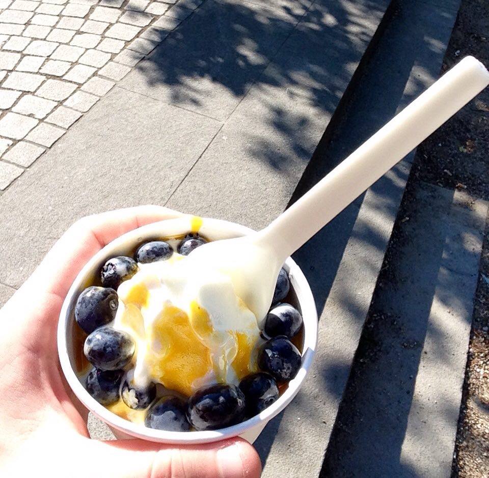 I took blueberries, which were in perfect harmony with the mango-sauce and the sunny weather. FroYo is definitely awesome stuff when I would put on my addictive potential rating 100%. It is not as sweet stickily and sickly paste, it tastes more refreshingly sweet, like a natural yogurt and revitalises your tongue on a hot day in summer!