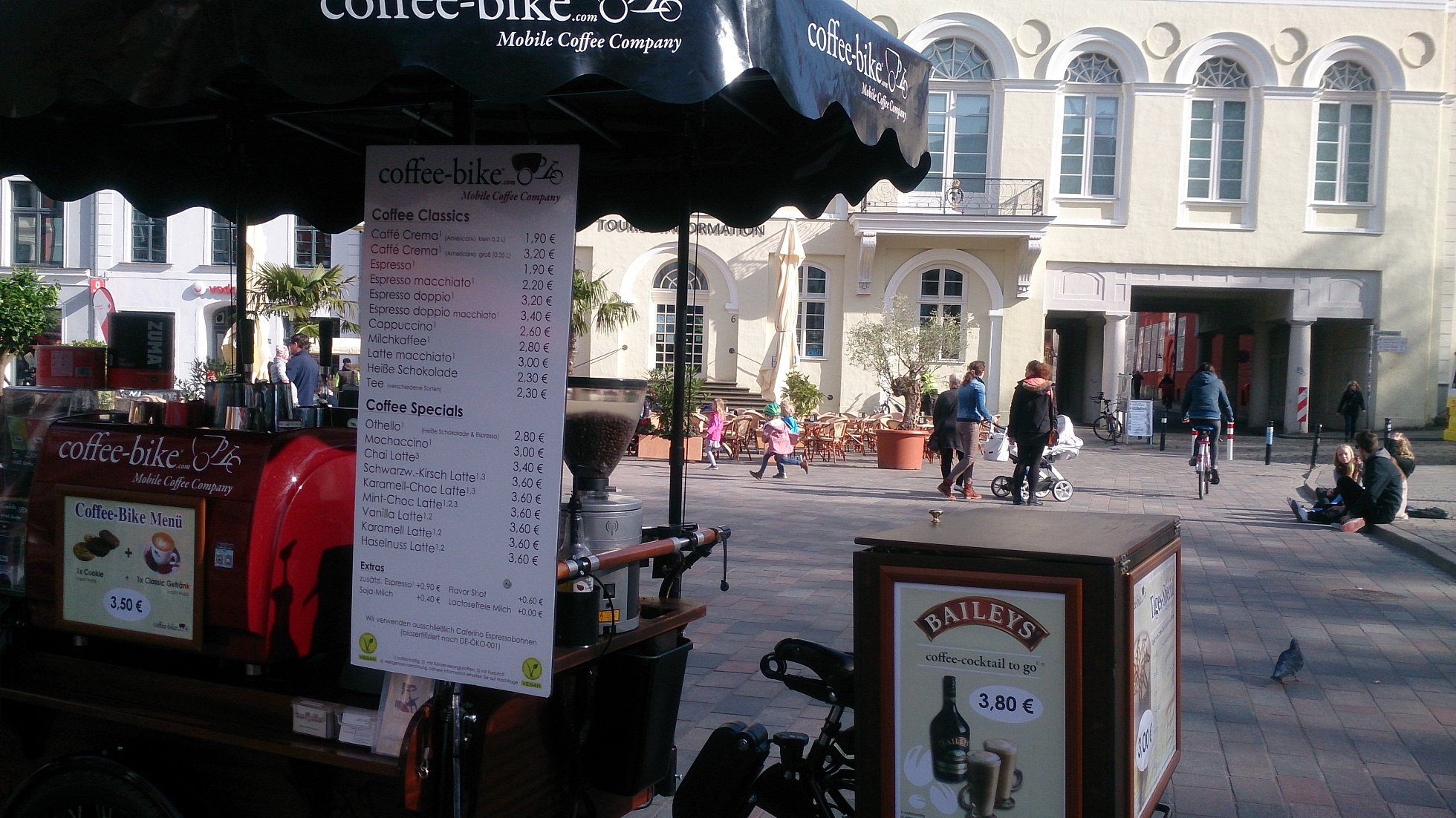 dly staff (they take their time to talk to you) prepare delicious and some creative coffee specialties for example a sweet hazelnut latte macchiato. This one I like most. One of the best things is that you are free to choose your place of enjoying it. You can walk through the street, sit somewhere in the green grass or at a bench on the Universitätsplatz. I enjoy buying my coffee there, because of the staff. Great coffees made with liquid treacles. The coffees are at a medium price range about €3.60. Every day there is a daily special which you can enjoy for only €3.00. It is very favorable that you can get all coffees with lactose- free milk so that you can enjoy their coffees even when you have a lactose intolerance. In my ease, it is the place where I can enjoy coffees together with my brother. The coffee bike usually stands in front of the “Universitätsplatz” in Rostock’s city centre, but you can find several other coffee bikes in places throughout Germany and Europe (if you are interested in finding a coffee bike: https://coffee-bike.com/de/).